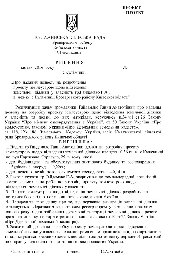 Головна → Рішення → Проект рішення "Про надання дозволу на розроблення проекту землеустрою щодо відведення земельної ділянки у власність гр. Гайдамако Г.А. в межах с. Кулажинці"