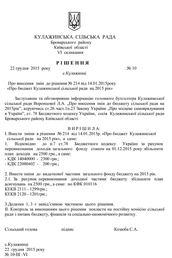 Головна → Рішення → Рішення №10 "Про внесення змін до рішення №214 від 14.01.2015 року "Про бюджет Кулажинської сільської ради на 2015 рік""