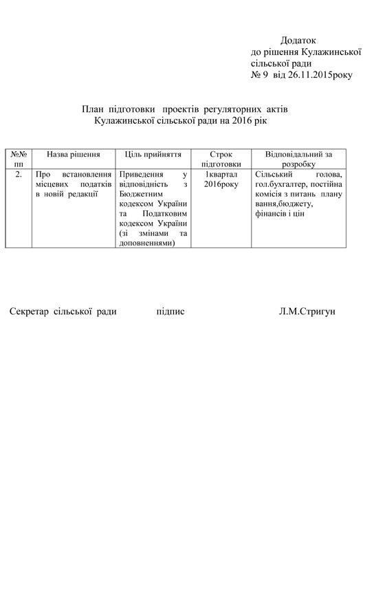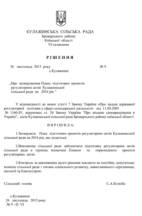 Головна → Рішення → Рішення №9 "Про затвердження Плану підготовки проектів регуляторних актів Кулажинської сільської ради на 2016 рік"